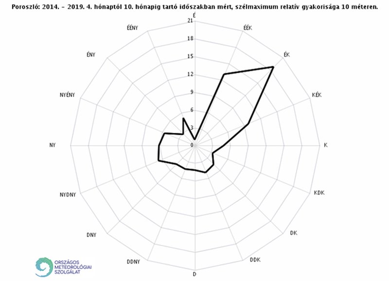 2014 és 2019 között áprilistól októberig mért poroszlói széladatokból készült szélrózsa