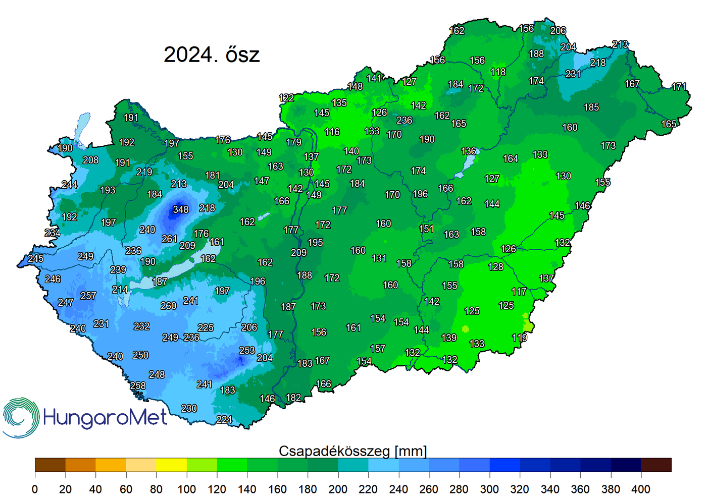 Az évszak csapadékösszege országos átlagban 180,0 mm – az előzetes adatok alapján –, ami az éghajlati normál közeli érték, azt 13%-kal haladja meg (1991–2020-as átlag: 158,6 mm) (3. ábra). A szeptemberi csapadék országosan 63%-kal meghaladta az átlagot, majd októberben 4%-kal hullott több csapadék, mint az 1991–2020-as átlag. A november viszont száraz hónap lett, aminek a csapadéka országos viszonylatban 36%-kal elmaradt a szokásostól. Az évszak legnagyobb csapadékösszegét Bakonybélen (348,3 mm), a legkisebbet Békéssámsonon (110,7 mm) mértük. A legcsapadékosabb területek a Bakony mellett a Mecsek környéke és a nyugati, délnyugati tájak voltak, nagy területen 200 mm-t meghaladó csapadékkal (4. ábra). Az ország többi részén általában 150 és 200 mm között volt az évszak csapadékösszege, míg a legszárazabb tájakon (Nógrád vármegye környéke, Tiszántúl déli fele) többfelé a 140 mm-t sem érte el a 2024 őszén mért csapadékösszeg.