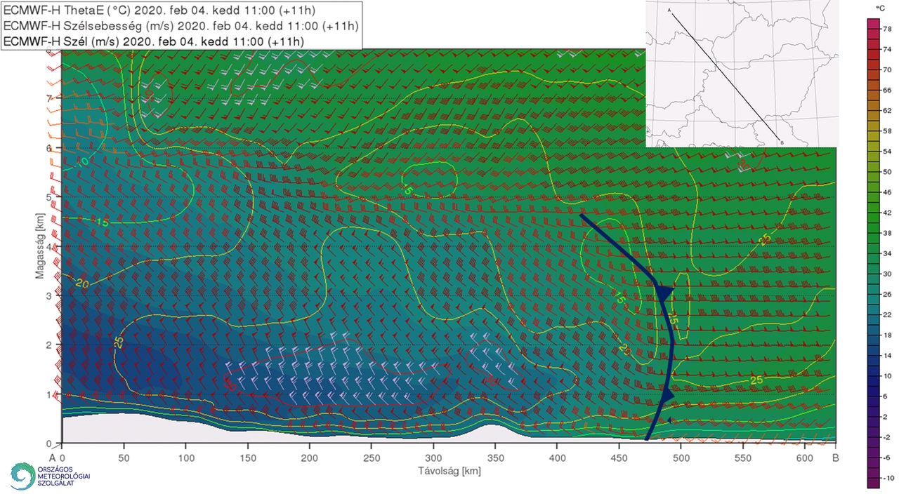 A hidegfront átvonulása vertikális metszetek alapján 2020. február 4. 12 órakor (11 UTC)