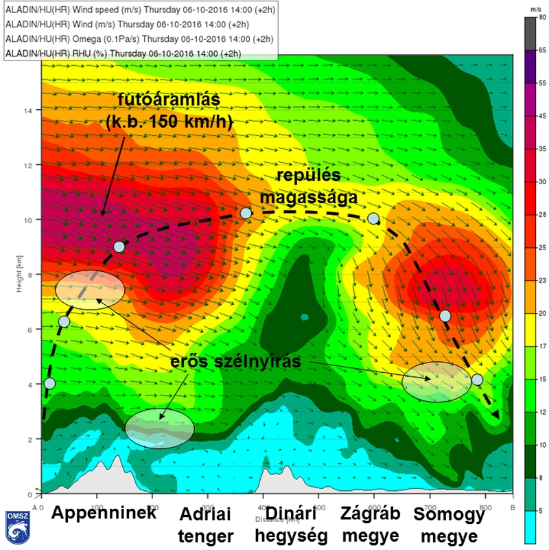 (nagyjából a repülés útvonala mentén) az ALADIN modell alapján (2016. október 6. 14 UTC).