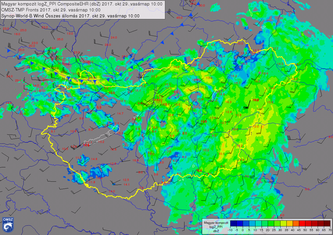 A hidegfront megérkezése az északnyugati határokhoz 2017. október 29. 11 órakor (10 UTC) az OMSZ radar mérések, és