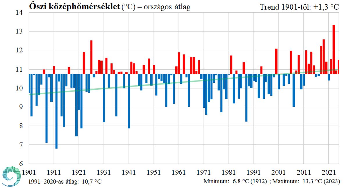 Az évszak középhőmérséklete országosan 11,5 °C (1991–2020-as átlag: 10,7 °C), ami 0,8 fokkal haladta meg az átlagot (1. ábra). A szeptember 2,2 fokkal volt melegebb az éghajlati normálnál, amivel a nyolcadik legmelegebb szeptember lett 1901 óta. Az ősz további része az átlagos körül alakult, az október 0,3 fokkal átlag alatti, a november 0,3 fokkal átlag feletti középhőmérsékletű volt. Az ősz középhőmérséklete az ország nyugati és északi részén, síkvidéken 11 és 12 fok között alakult, míg az ország déli tájain meghaladta a 12 fokot. 10 fok alatti értékek csak a hegyvidékeken, és az Északi-középhegység fagyzugos völgyeiben fordultak elő (2. ábra).