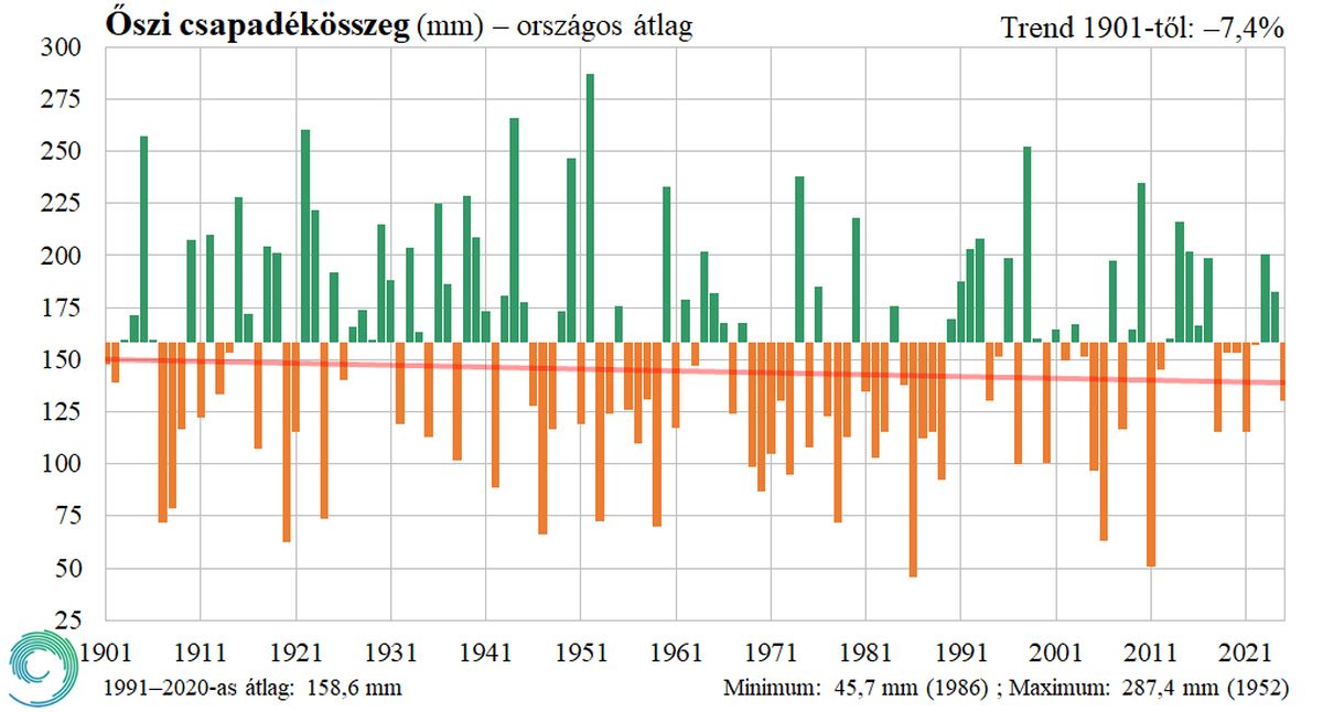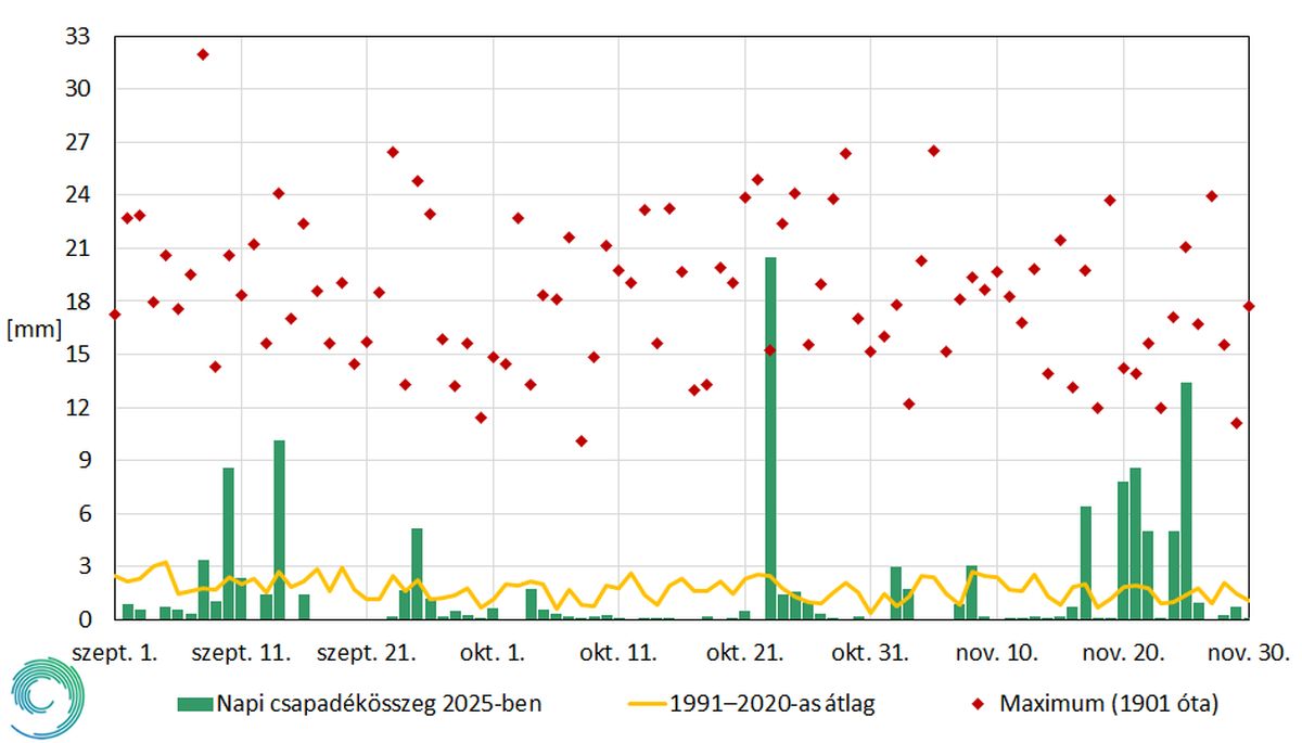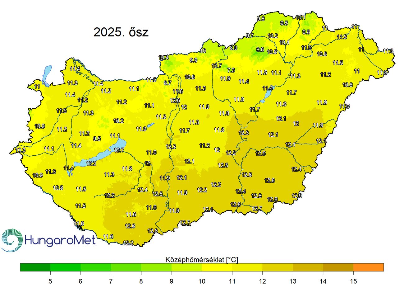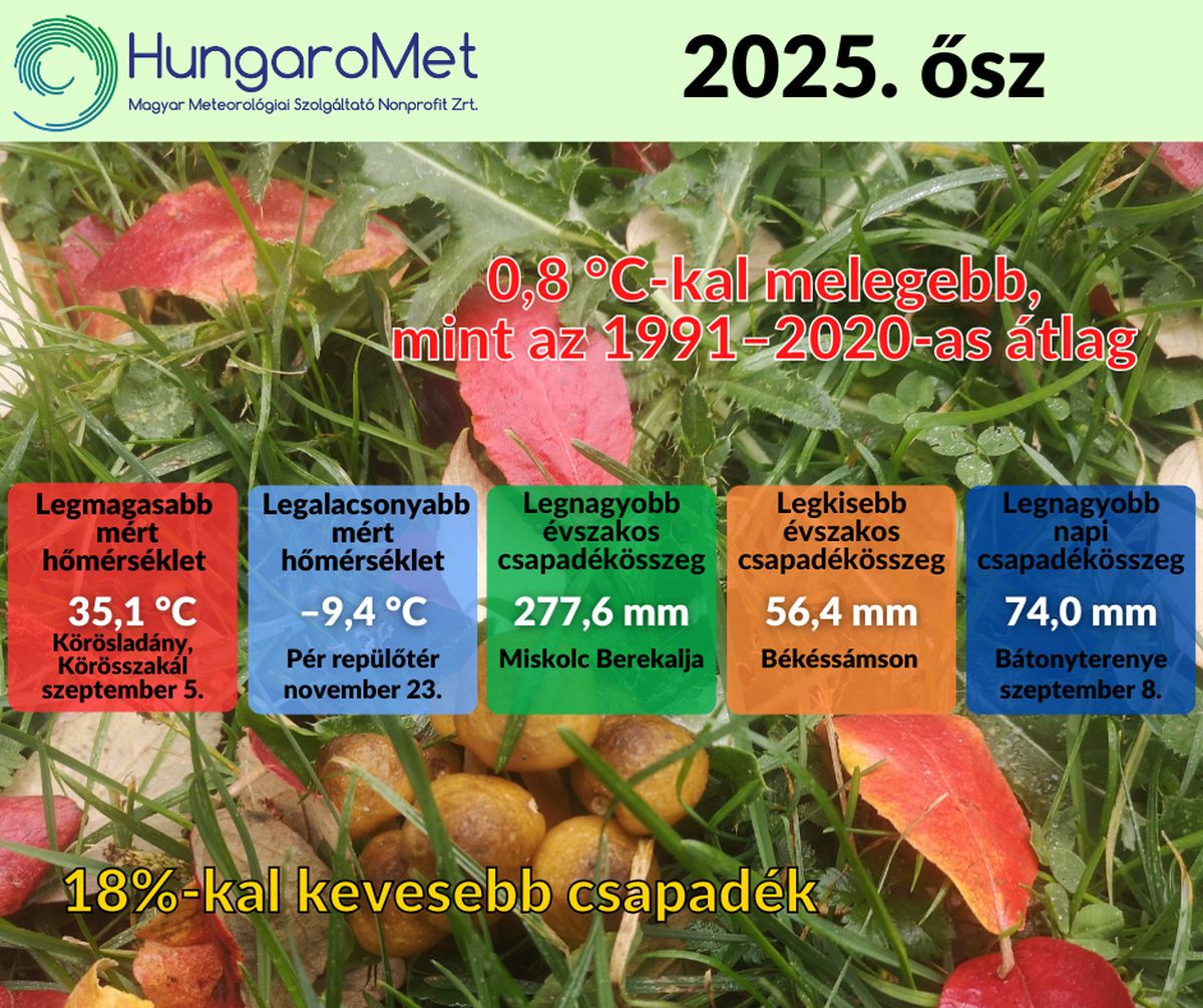 A HungaroMet Nonprofit Zrt. mérései alapján a 2025-ös ősz középhőmérséklete országos átlagban 0,8 fokkal meghaladta az 1991–2020-as éghajlati normált. A meleg szeptembert követően az átlag körül alakult a hőmérséklet. Csapadék tekintetében az év utolsó évszaka is száraz volt, csak novemberben hullott a szokásosnál több csapadék.
