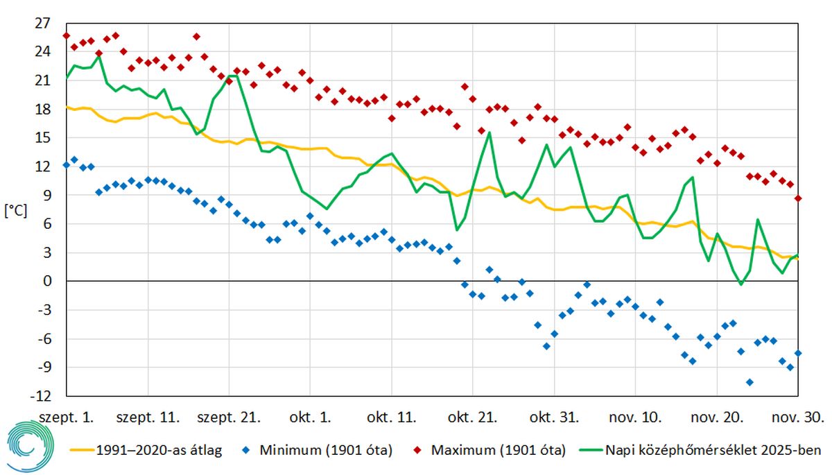 Október 3-án több, mint 6 fokkal maradt el a napi középhőmérséklet országos átlaga a normál értéktől, Zabar állomásunkon pedig -4,6 fokig hűlt a levegő, amivel megdőlt az országos napi minimumhőmérséklet rekordja. Október 4-én egy érkező frontrendszer okozott országszerte kisebb csapadékot, majd fokozatos melegedés vette kezdetét és október 8-tól az átlagos körül alakult a hőmérséklet. Ezt követően anticiklon miatt számottevő csapadék október közepén sem volt, a frontok többnyire a Kárpát-medencétől keletre vonultak el. Nagyobb napi hőingás jellemezte ezt az időszakot, a derültebb tájakon fagy is előfordult, majd a délutáni órákra jellemzően 20 fok közelébe melegedett a levegő. Október 18-án egy hidegfront mögött kitisztult a levegő, emiatt másnap az ország nagy részén fagyott, több állomásunkon -5 fok alatt volt a minimumhőmérséklet. A következő napokon délies áramlással átmenetileg jelentősen melegebbé vált az idő. Október 22-én és 23-án a legmagasabb hőmérséklet az ország nagy részén meghaladta a 20 fokot, a déli határnál 25 fok közelében volt és az éjszakai fagyok is megszűntek. Jelentős változást az október 23-án érkező hidegfront hozott. Az ország jelentős részén 10 mm-t meghaladó csapadék hullott, de a Dunántúl északi és nyugati tájain sokfelé 30 mm-nél is több esett (pl. Dabrony: 56,4 mm), és az országos átlag is meghaladta a 20 mm-t, amivel országos viszonylatban a 2025-ös ősz legcsapadékosabb napja lett. A hidegfront mögött több fokkal visszaesett a hőmérséklet. Az október utolsó hetét változékony időjárás, gyakori frontátvonulások jellemezték. Október 24-én már csak északkeleten hullott nagyobb mennyiségű csapadék, majd 25-én az Alföld középső részén alakultak ki zivatarok, majd 26-án nyugaton és délen, 27-én északon esett néhány mm eső. Egy hullámzó frontrendszer előoldalán melegebb levegő áramlott térségünkbe, emiatt a szokásosnál több fokkal melegebb idővel teltek október utolsó napjai. November elején is folytatódott az átlagnál melegebb időjárás, többfelé 20 fokot meghaladó maximumhőmérsékletekkel. November 2-án Sellyén 24,2 fokig melegedett a levegő, majd november 3-án a frontrendszer átvonult az ország felett és mögötte az átlagos közelébe csökkent a hőmérséklet. Jelentősebb csapadék a Dunántúl nyugati felére érkezett. A front mögött kitisztult és csapadékmentes napok következtek, többnyire sok napsütéssel, de helyenként (pl. Sajó völgye) tartósabban megmaradt az éjszaka képződött köd. A gyenge éjszakai fagyokat követően a napos tájakon délutánra általában 15 fok közelébe melegedett a levegő. November 7-én és 8-án egy hidegcsepp okozott csapadékot főleg az ország keleti felén. A folytatásban anticiklon alakította időjárásunkat és november 9-től a köd és alacsonyszintű rétegfelhőzet egyre tartósabban megmaradt. November 12-én már csak a hegyvidékek emelkedtek ki az alacsonyszintű rétegfelhőzetből. Emiatt a legmagasabb hőmérsékleteket is ott mértük, például november 12-én 10,4 fok volt a legmagasabb mért hőmérséklet, amit Dobogókő állomásunkon mértünk, miközben síkvidéken általában 5–6 fok volt a maximum. November 14-én és 15-én egy közeledő frontrendszer hatására megélénkülő szél az ország déli felén nagyobb területen feloszlatta a rétegfelhőzetet, így a napos déli tájakon 15 fok fölé melegedett a levegő napközben. November 16-án már az északi vármegyékben is felszakadozott a rétegfelhő, több állomásunkon 20 fok fölé emelkedett a hőmérséklet, november 17-én az Alföldön zivatarok alakultak ki, majd november 18-ra átvonult a hullámzó frontrendszer. Többfelé jelentősebb mennyiség csapadék esett, ami nagyrészt eső volt, de a Mátra és Bükk magasabb részen havazott is és vékony hóréteg is kialakult. A hidegfront mögött kitisztult és a még felhősebb déli tájak kivételével nov. 19-én ismét megjelentek a fagyok, a legmagasabb hőmérséklet pedig 10 fok alá esett vissza. A folytatásban is maradt a változékony időjárás, november 20-tól egy mediterrán ciklon okozott tartósan csapadékos időt. Kezdetben eső hullott, majd a hegyvidékek mellett főleg a Dunántúlon síkvidéken is egyre nagyobb területen váltott át az eső havazásba. November 23-án reggelre a Dunántúlon síkvidéken nagy területen alakult ki 5–15 cm-es hóvastagság, míg a hegységekben (pl. Mecsek, Bakony, Mátra, Bükk) 20–30 cm hóvastagság alakult ki. November 23-án a Dunántúl keleti felén nagyobb területen egész nap fagyott, és reggelre a havas tájakon többfelé -5 fok alá csökkent a hőmérséklet. A november 23-án Pér repülőtér állomáson mért -9,4 fok az évszak legalacsonyabb mért hőmérséklete. November 23-án a napi középhőmérséklet országos átlaga is fagypont alatt maradt, -0,3 fok volt. A havas, hideg idő nem bizonyult tartósnak, mert egy újabb mediterrán ciklon előoldalán megenyhült és síkvidéken gyorsan elolvadt a hótakaró, valamint a Dunántúlon és északon jelentős mennyiségű eső is hullott. November 25-én a napi csapadékösszeg Gerecse tető állomáson 67,4 mm volt, ami új országos napi csapadék rekord. November utolsó napjaira az átlagos közelébe, kevéssel az alá esett vissza a hőmérséklet, az éjszakai fagyokat követően napközben is általában 5 fok alatt maradtak a maximumok, országosan jelentősebb mennyiségű csapadék már nem esett. Az évszak végén egyre inkább anticiklon alakította időjárásunkat, visszatért a párás, ködös, rétegfelhős időjárás. Az ősz utolsó napja is hasonló idővel telt, csak a délnyugati tájakon szakadozott fel a felhőzet és sütött a nap.