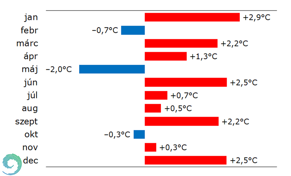 Az országos havi középhőmérsékletek eltérése 2025-ben az 1991–2020-as átlagtól