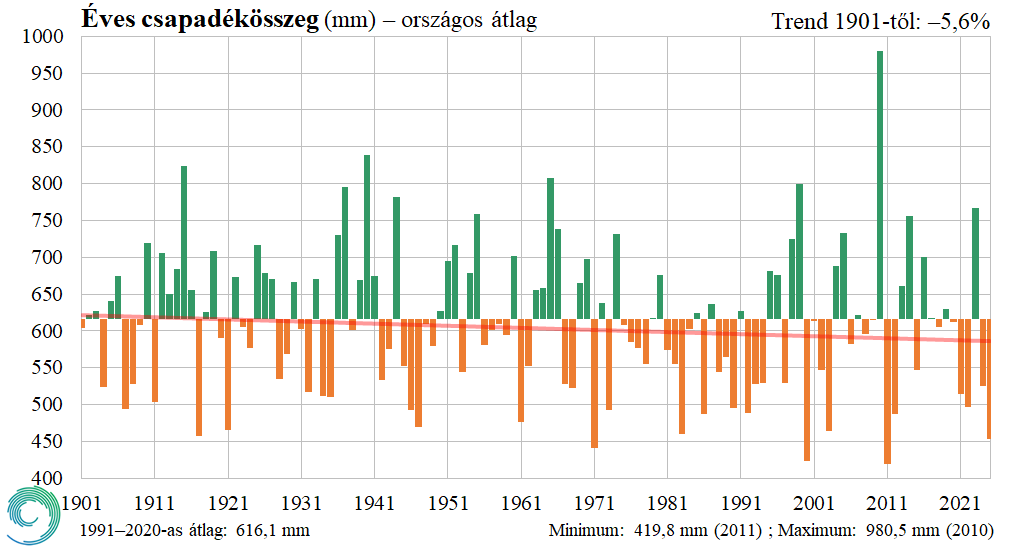 Az éves csapadékösszeg Magyarországon 1901 és 2025 között az 1991–2020-as