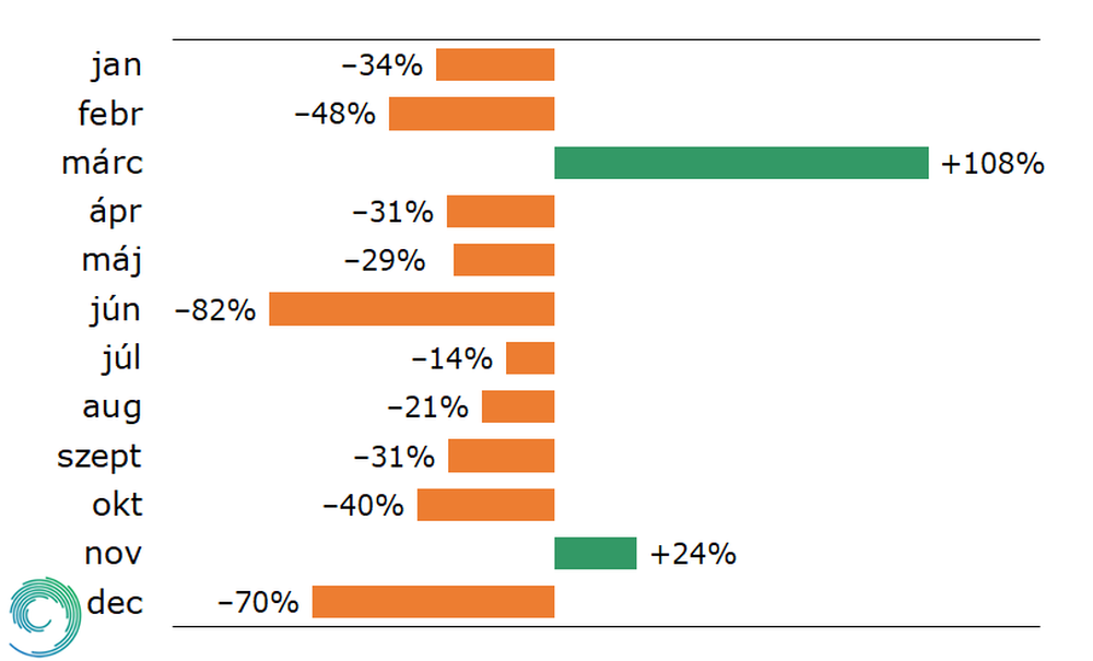 Az országos havi csapadékösszegek eltérése 2025-ben az 1991–2020-as átlagtól
