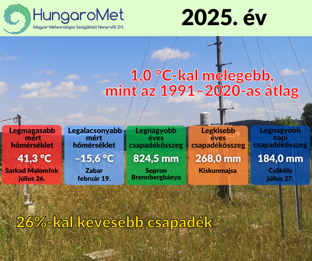 Ezt az évet is az átlagnál melegebb hónapok sora jellemezte. Az átlagnál több, mint 2 fokkal melegebb volt a január, a március, a június, a szeptember és a december. Országosan a június a második, a szeptember a nyolcadik, míg a március a tizedik legmelegebb volt 1901 óta. Az évszakok közül a nyár a hetedik legmelegebb lett a XX. század eleje óta. Csak három hónap (február, május, október) középhőmérséklete maradt el a szokásostól (4. ábra). Több hőhullám is volt az évben, a legmagasabb hőmérséklet a 40 fokot is meghaladta. A HungaroMet mérőhálózatában a 2025-ös évben mért legmagasabb hőmérséklet 41,3 fok (Sarkad Malomfok, július 26.), míg a legalacsonyabb -15,6 fok (Zabar, február 19.) volt.