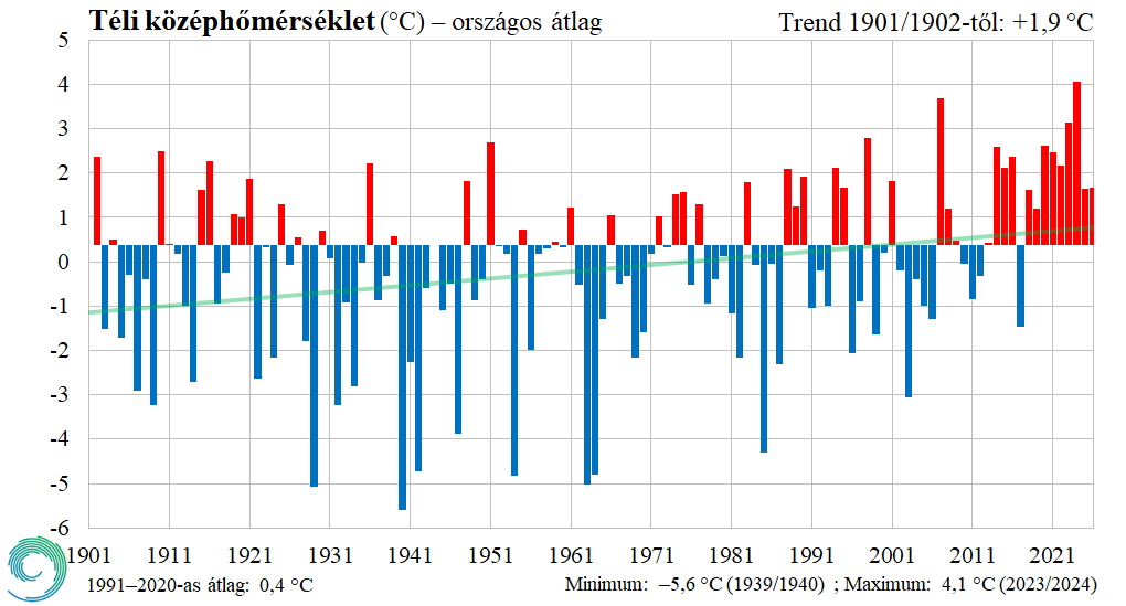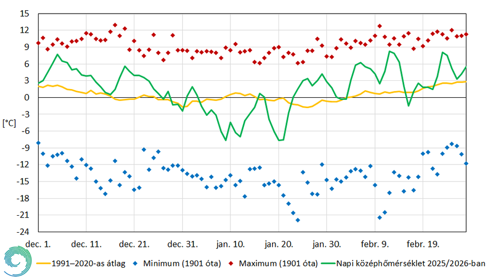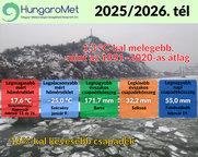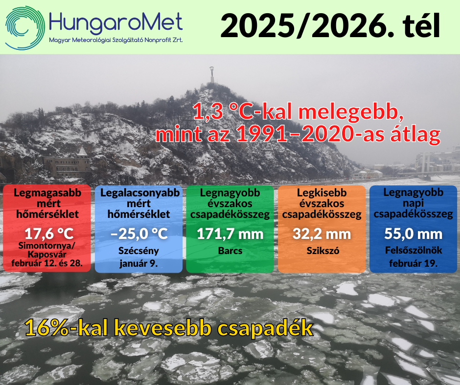 A nagyon enyhe december és február mellett januárban ugyan volt egy több hetes hidegebb, havasabb időszak, ezzel együtt összességében a 2025/2026-os tél is enyhe volt. A HungaroMet mérései alapján a tél középhőmérséklete országos átlagban 1,3 fokkal meghaladta az 1991–2020-as éghajlati normált. Az évszak csapadékösszege országosan kevéssel elmaradt a szokásostól. A nagyon száraz decembert egy csapadékosabb és az utóbbi évekhez képest havasabb január követett, majd az évszak egy átlagosan csapadékos februárral zárult.
