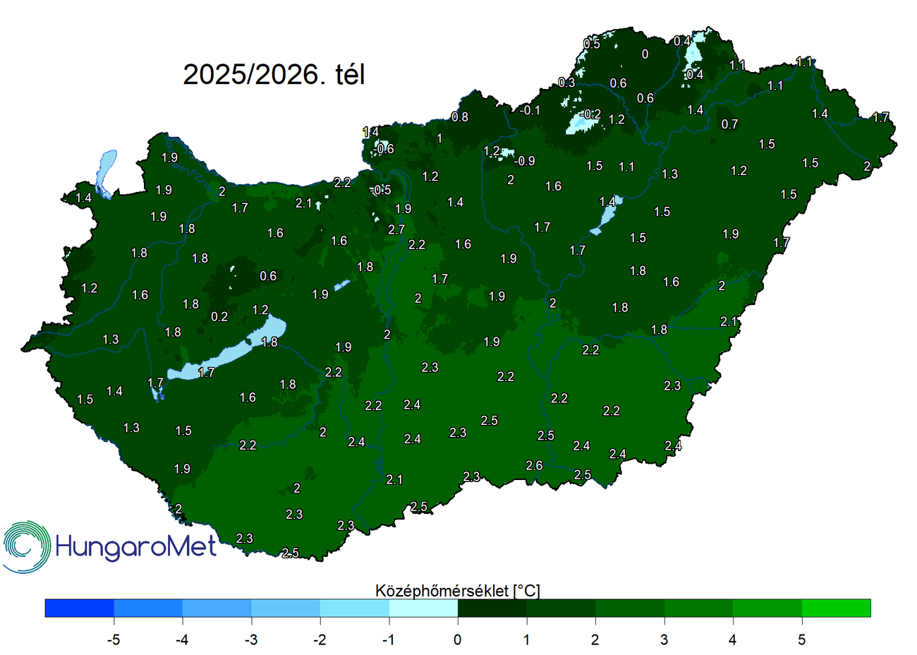 Az évszak középhőmérséklete országosan 1,68 °C (1991–2020-as átlag: 0,38 °C), ami 1,3 fokkal haladta meg az átlagot (1. ábra). Az idei volt sorozatban a kilencedik enyhe tél a 2016/2017-es hideg tél óta. A december és a február is 2,5 fokkal volt enyhébb az éghajlati normálnál, míg a január 1,2 fokkal átlag alatti hőmérsékletű volt. A 2026-os január volt a 2020-as évtized első negatív középhőmérsékletű hónapja, és a 2017-es január óta a leghidegebb hónap. A tél középhőmérséklete a déli vármegyékben általában meghaladta a 2 fokot, míg észak felé csökkent az évszak középhőmérséklete. Az ország északi felén síkvidéken jellemzően 1 és 2 fok között alakult a tél középhőmérséklete, ennél alacsonyabb, helyenként fagypont alatti értékek a hegyvidékeken fordultak elő (2. ábra).