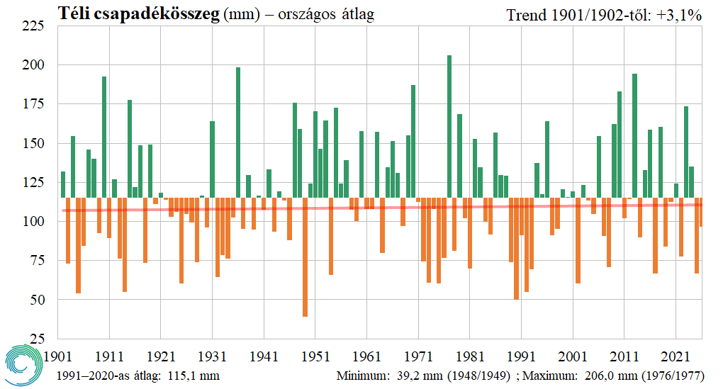 A téli csapadékösszeg Magyarországon 1901/1902 és 2025/2026 között az 1991–2020-as