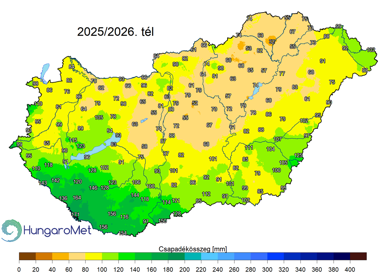 Az évszak csapadékösszege országos átlagban 96,5 mm – az előzetes adatok alapján –, ami az éghajlati normál 84%-a (1991–2020-as átlag: 115,1 mm) (3. ábra). A december nagyon száraz hónap volt, a szokásosnál 70%-kal kevesebb csapadék hullott, amivel a tizedik legszárazabb december lett a XX. század kezdete óta. A 2026-os év csapadékosan kezdődött, a januári csapadék 41%-kal meghaladta az átlagot, majd februárban az 1991–2020-as átlagnak megfelelő mennyiségű csapadék hullott országos átlagban. Az évszak legnagyobb csapadékösszegét Barcson (171,7 mm), a legkisebbet Szikszón (32,2 mm) mértük. A legcsapadékosabb területek a Dél-Dunántúlon voltak, ahol többfelé meghaladta a 150 mm-t a téli csapadékmennyiség (4. ábra). A legkevesebb csapadék északon, a Bükk környékén hullott, ahol több állomásunkon 60 mm alatt maradt a 2025/2026-os tél csapadékösszege.