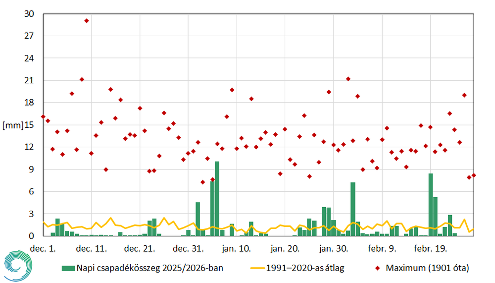 Napi csapadékösszegek országos átlagai 2025/2026 telén, valamint az 1991–2020-as átlag, illetve