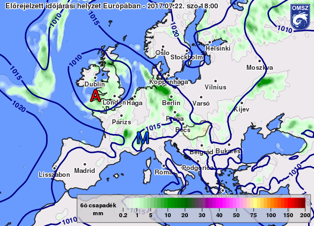 A szombati jellemző nyomási kép a délutáni (14 és 20 óra között lehulló) csapadékmezővel