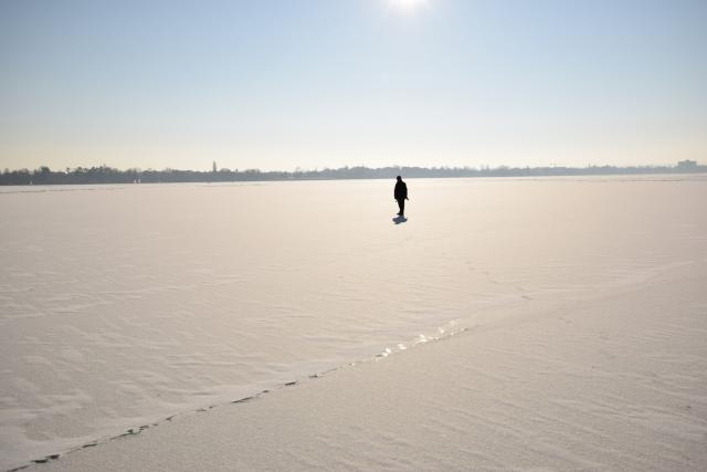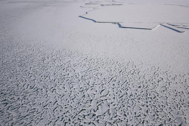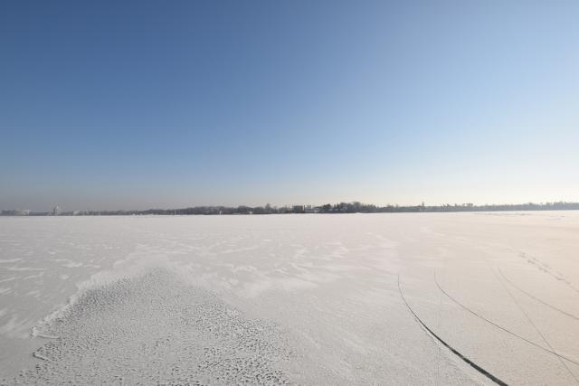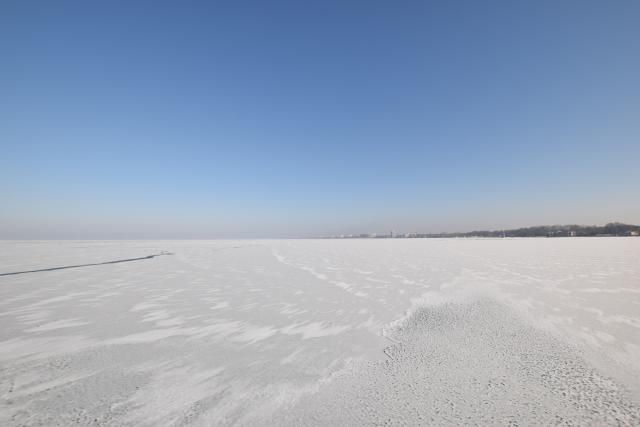 A jégfelületre hullott vékony hóréteg miatt a tó felszíne végtelen hómezőnek tetszik
