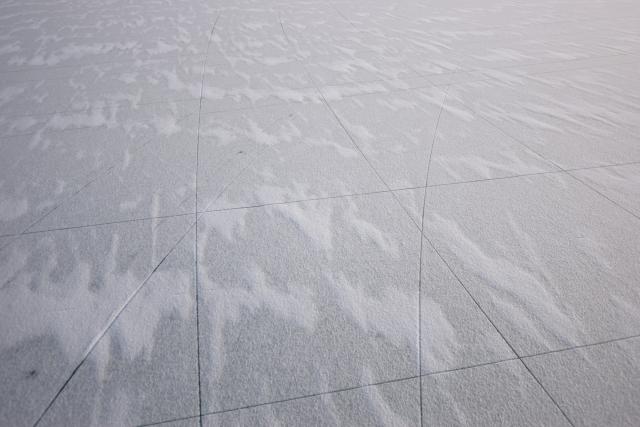 Jégvitorlások által mozaikosan összekaristolt havas jégfelszín