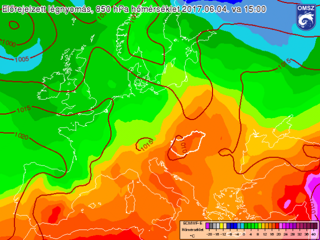 2. ábra: Előrejelzett légnyomás és 850 hPa-os hőmérséklet (~1500 m) 2017.06.04. 17 órára (15 UTC)