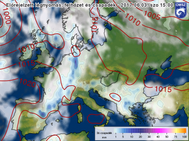 1. ábra: Előrejelzett légnyomás, felhőzet és csapadék 2017.06.03. 17 órára (15 UTC)