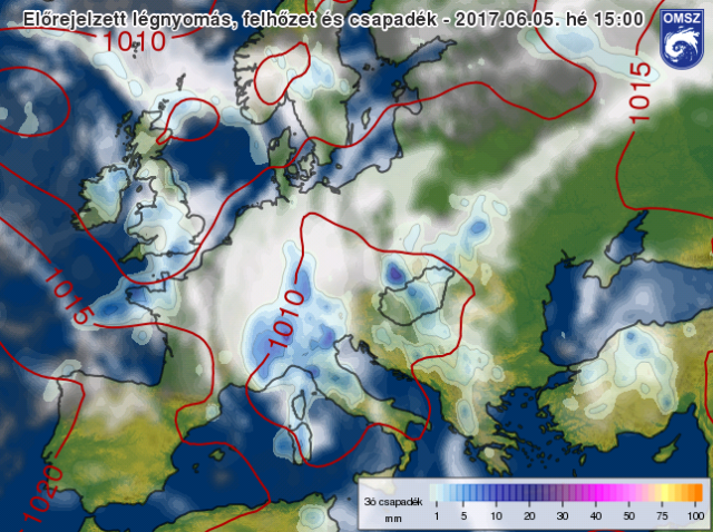 3. ábra: Előrejelzett légnyomás, felhőzet és csapadék 2017.06.05. 17 órára (15 UTC)