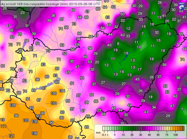 1. ábra: A 2015.05.19. 06 UTC és 2015.05.26. 06 UTC között lehullott csapadék mennyisége