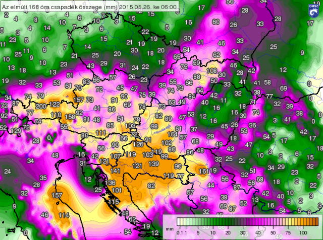 A Kárpát-medencében és környékén az elmúlt hét napban általában 40-80 mm csapadék hullott, de az Alpokban, Horvátország nagy részén és a Vajdaságban elérte a 80-150 mm-t, sőt Voralbergben néhol még a 150-200 mm-t is. Ugyanakkor Erdély keleti részén, illetve hazánkban Szolnok, Hajdú-Bihar és Szabolcs-Szatmár-Bereg nagy részén csak 5-20 mm volt a csapadék mennyisége. (1. ábra)