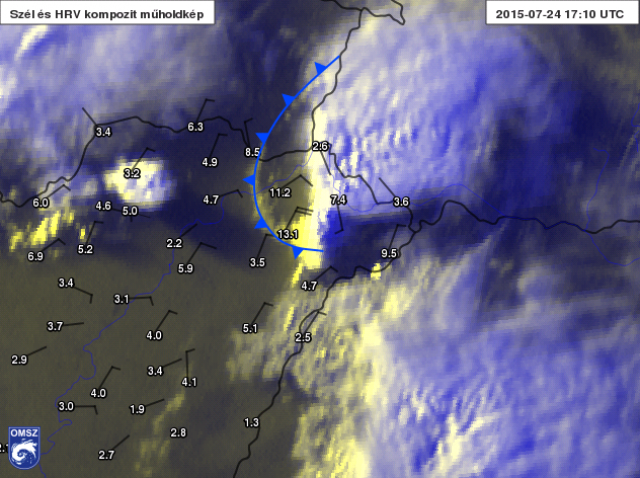 Az 1. képen a 19:10-es műhold- és radarképet, azon belül a Nyíregyházától keletre tomboló erős zivatargócot láthatjuk. A góctól nyugatra többnyire derült az ég, de a műholdképen érdekes, szinte szabályos körívet lehet felfedezni. Ez az ív nem más, mint a zivatar alól kiáramló hideg levegő éle, az ún. gust (lökés) front. A frontvonal tulajdonságai alapján részben hasonlít egy igazi hidegfronthoz, tehát hirtelen feltámadó szél, mögötte pedig visszaeső hőmérséklet jellemzi. Nyíregyházán hirtelen 13.1 m/s-os (~48 km/h-s) szél támadt, Vásárosnaményban pedig egészen 22 fokig csökkent a hőmérséklet (2. és 3. kép). A vonal létrejöttét és gyors mozgását az okozza, hogy nagy nyomáskülönbség alakul ki a csapadék által lehűtött - így relatíve sűrűbb - levegő és a környezetét kitöltő sokkal melegebb - így relatíve ritkább légtömeg között, s ez igyekszik kiegyenlítődni.