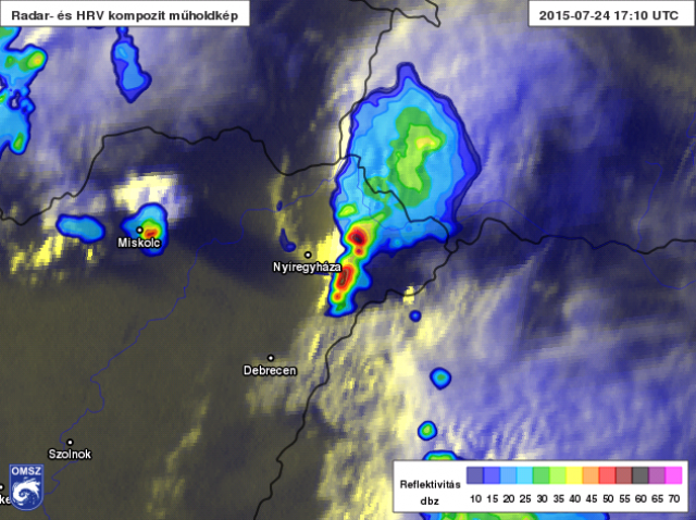 1. kép: 19:10-es radar- és műholdfelvétel a Nyíregyháza melletti zivatarról és az abból kiinduló