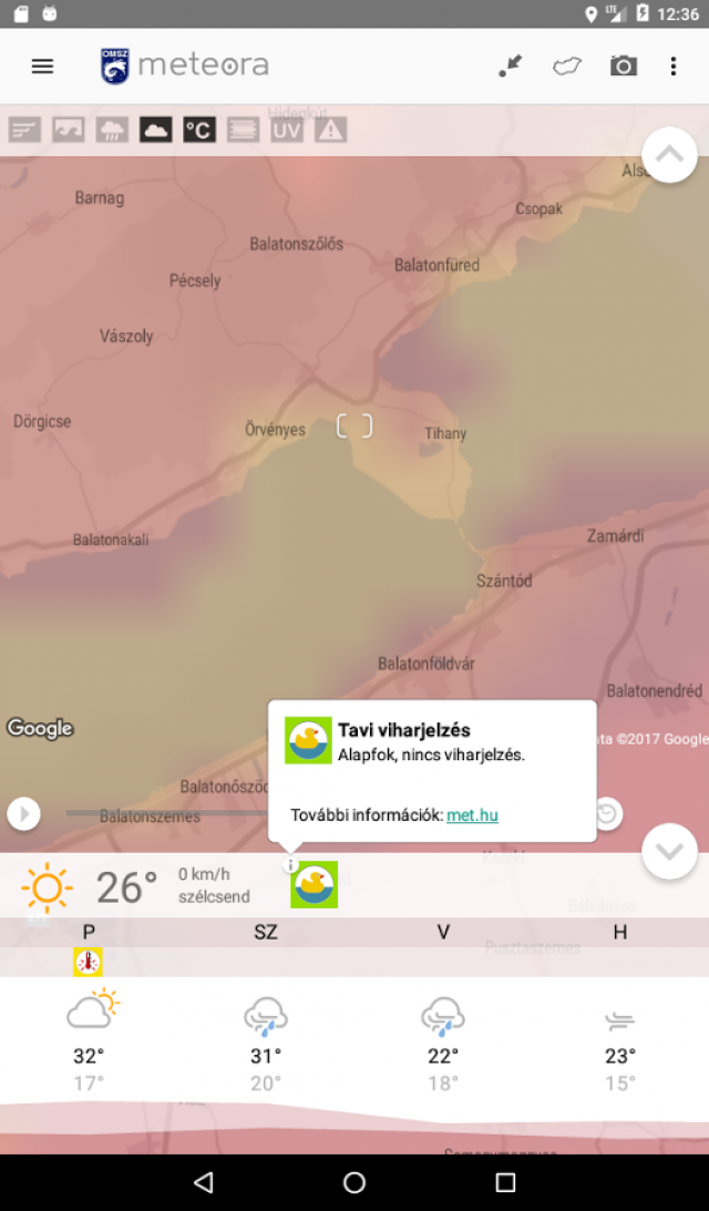 A tavi viharjelzés aktuális állapotát mutató Meteora térkép réteg