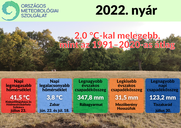 Az évszak középhőmérséklete országosan 22,8 °C (1991–2020-as átlag: 20,8 °C), ami fél fokkal melegebb az eddigi csúcstartó 2003-as nyárnál (1. ábra). A június 2,3, a július 1,6, az augusztus 2,0 fokkal volt melegebb a szokásosnál. Országos átlagban a július és az augusztus középhőmérséklete is 23 fok felett alakult. A június a harmadik, a július az ötödik, az augusztus a második legmelegebb lett a XX. század kezdete óta.