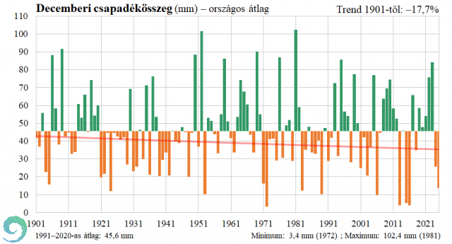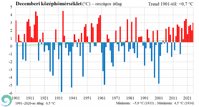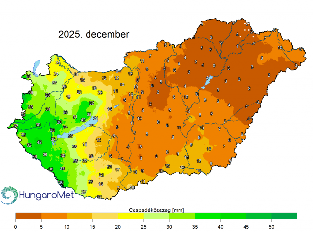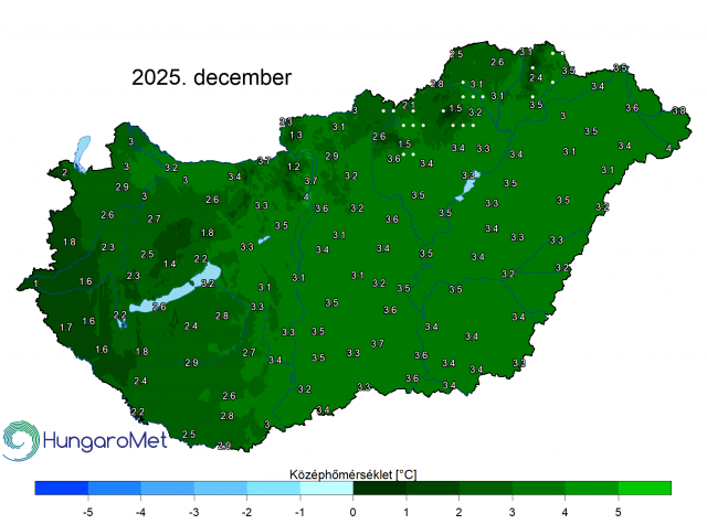 A 2025. december középhőmérséklete a HungaroMet Nonprofoóit Zrt. mérései alapján országos átlagban 3,0°C, ami jelentősen, 2,5 fokkal haladja meg az 1991–2020-as átlagot. Az anticiklonos idő miatt a 2025-ös év utolsó hónapjában kevés csapadék hullott, a havi csapadék országos átlagban – az eddig beérkezett adatok alapján – csupán 13,8 mm, ami 70%-kal elmaradt az átlagtól (1991–2020-as átlag: 45,6 mm) és ezzel a 10. legszárazabb december 1901 óta.